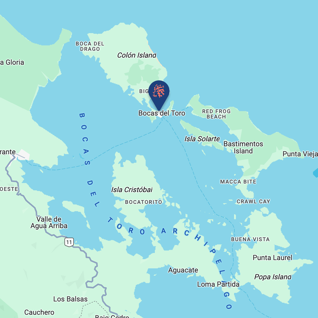 We are located on the mainland of Isla Colon in Bocas del Toro, Panama. This archipelago is home to reefs, rainforests, and essential marine life like sharks, sea turtles, bottlenose dolphins, 120+ species of sponge, three species of mangroves, and a diverse array of Caribbean coral species.